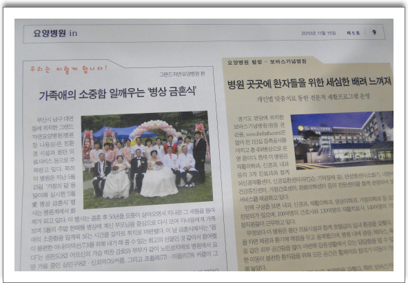 그랜드자연요양병원은 대한노인요양병원협회보 촌로 제5호 요양병원 IN에 소개되었다.촌로는 노인의료를 아름답게 만드는 사람들이라는 캐치프레이드로 격월간지로 발간되어지고 있다. [원문] 가족애의 소중함을 일깨우는 “병상금혼식” 부산시 남구 대연동에 위치한 그랜드자연요양병원(병원장 나용승)은 친환경 시설과 첨단 의료서비스 등으로 주목받고 있다. 특히이 병원은 지난 5월15일‘가정의 달’을맞이해 실시한‘5월愛병상 금혼식’행사는 병원계에서 화제가 되고 있다. 이 행사는 결혼 후 50년을 오롯이 살아오면서 지나온 그 세월을 돌아보며 5월의 주말 한때를 병상에 계신 부모님을 중심으로 다시 모여 자녀들에게 가족애의 소중함을 일깨워 보는 시간을 갖자로 취지로 마련됐다. 이 날 금혼식에서는“몸이 불편한 아내(이덕선/73)를 위해 내가 해 줄 수 있는 최고의 선물인것 같아서참여했다”는 권판도(82) 어르신의 가슴 벅찬 감회와 부부가 같이 노인성치매로 병원에서 요양 가료 중인 심인구(82)•신외덕(76)커플, 그리고 조철래(77)•이필리(78) 커플이 그 주인공이다.이 날 병상 금혼식의 주례는 부산남구문화원 최원철 이사(전 부산대교수)가 맡았으며, 부산남구문화원 성재영 원장, 최원철 부산남구문화원 이사(시인/수필가), 황영식 기러기문화원원장, 대남초등학교 이용빈 교장, 부산여대 김효신 교수 등 많은분들이 참석했다. 나용승 병원장은“50년 이상을 해로 하시며 살아온 어르신들이 비록 병상이지만 건강하고 우아한 노년기 문화를 누리실 수 있도록 가족들의 보살핌과 배려는 이 세대가 노인들에게 돌려주어야 되는 작은 책무”라며“황혼 이혼의 증가 추세의 요인에 자식과 부모 사이의 괴리감에서 오는 무관심이 차지하는 비중이 크다. 이러한 병상금혼식이 환자보호자와 주변인들에게 노인에 대한 관심과 가족애를 다시 한 번 느끼게 하는 계기가 되었으면 한다”고말했다. ‘세상에서 가장 아름다운 결혼식! 5월愛병상금혼식! 세상에 다시 태어나도 당신만을 사랑해’라는 사연을 담은 이 날 행사는 오전 11시부터 오후 2시까지 이어졌으며 가족들이 모여서 웨딩드래스와 턱시도를 차려입은 부모님들에게 병상금혼식을 축하하는 큰절도 올리고 400여명의 축하 하객들과 자원봉사자들은 병원에서 준비한 점심식사인 장수의 의미가 담긴 국수를 함께 나눠먹었다. 이어서 열린 축하 미니콘서트는 그 동안 30회에 걸쳐 열린 그랜드자연병원음악회 출연진들의 무대로 가족들은 물론 남구지역 주민, 자원봉사자, 강서구 어르신문화나눔봉사단 등 많은 단체들도 참여해 병상금혼식이 성황을 이루었다. [출처:촌로 제5호 2010.11.15/글.이성준]