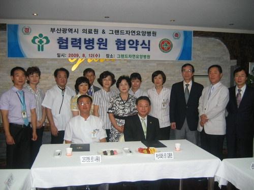 부산의료원-그랜드요양 협약식 부산의료원(원장 김동헌)과 그랜드자연요양병원(원장 나용승)는 12일 오후 부산 남구 대연동 그랜드자연요양병원 1층 리셉션룸에서 협력병원 협약식(사진)을 가졌다. 이날 행사에서 양측 의료진은 협약식을 통해 노인환자와 암환자 진료분야에서 긴밀한 협조관계를 갖기로 했다. 출처:부산일보 | 19면 | 입력시간: 2009-08-14 [08:49:00]