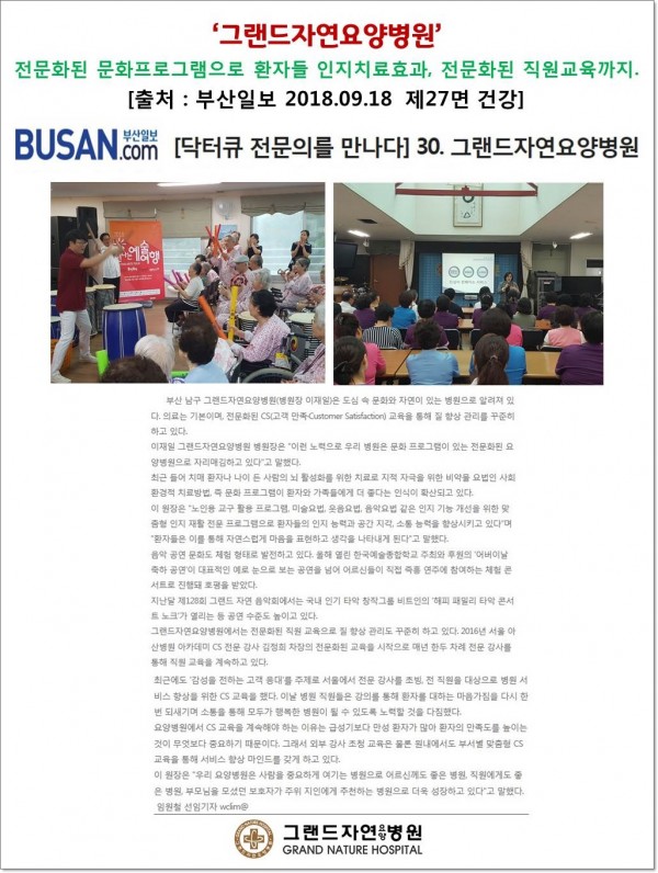 [부산일보] 전문화된 문화프로그램으로 환자들 인지치료효과, 전문화된 직원교육까지. 페이지 정보 작성자 최고관리자 작성일18-09-26 16:50 조회1,804회 댓글0건 이전글 다음글 목록 본문 [ 출처 : 부산일보 2018. 9.18 제27면 임원철 선임기자 ] 댓글목록 등록된 댓글이 없습니다. 이전글 다음글 목록