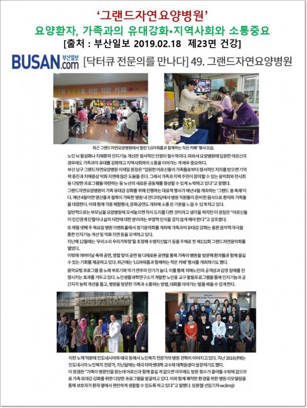 [부산일보] "요양환자, 가족과의 유대강화.지역사회와 소통 중요" 페이지 정보 작성자 최고관리자 작성일19-02-22 17:42 조회1,525회 댓글0건 이전글 다음글 목록 본문 [ 출처 : 부산일보 2019. 02.18 제23면 건강 ] 댓글목록 등록된 댓글이 없습니다. 이전글 다음글 목록