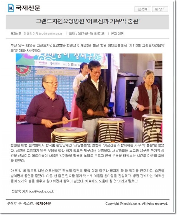 [국제신문] 그랜드자연요양병원 '어르신과 가무악 춤판' 페이지 정보 작성자 최고관리자 작성일17-06-02 15:54 조회1,348회 댓글0건 이전글 다음글 목록 본문 [출처 : 국제신문 2017.5.30 제29면 정철욱기자] 댓글목록 등록된 댓글이 없습니다. 이전글 다음글 목록