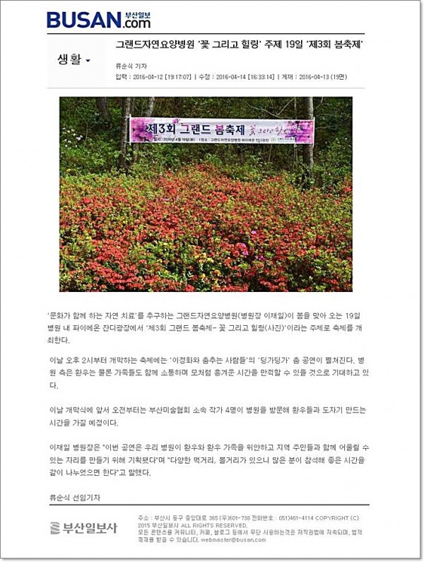 [부산일보] 그랜드자연요양병원 '꽃 그리고 힐링'주제 19일 "제3회 봄축제" 페이지 정보 작성자 최고관리자 작성일16-04-26 09:53 조회1,528회 댓글0건 이전글 다음글 목록 본문 [출처 : 부산일보 2016.4.13 제19면 류순식 선임기자] 댓글목록 등록된 댓글이 없습니다. 이전글 다음글 목록