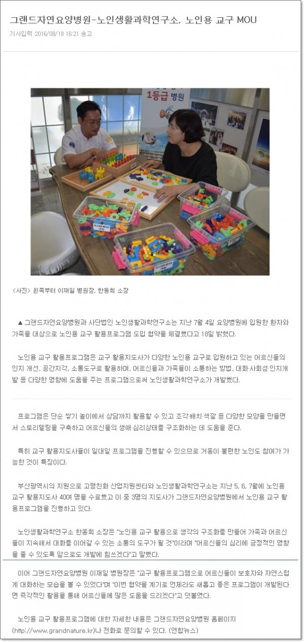 [연합뉴스] 그랜드자연요양병원 - 노인생활과학연구소, 노인용 교구 MOU 페이지 정보 작성자 최고관리자 작성일16-09-12 17:52 조회1,383회 댓글0건 이전글 다음글 목록 본문 [출처 : 연합뉴스 2016.8.18 ] 댓글목록 등록된 댓글이 없습니다. 이전글 다음글 목록