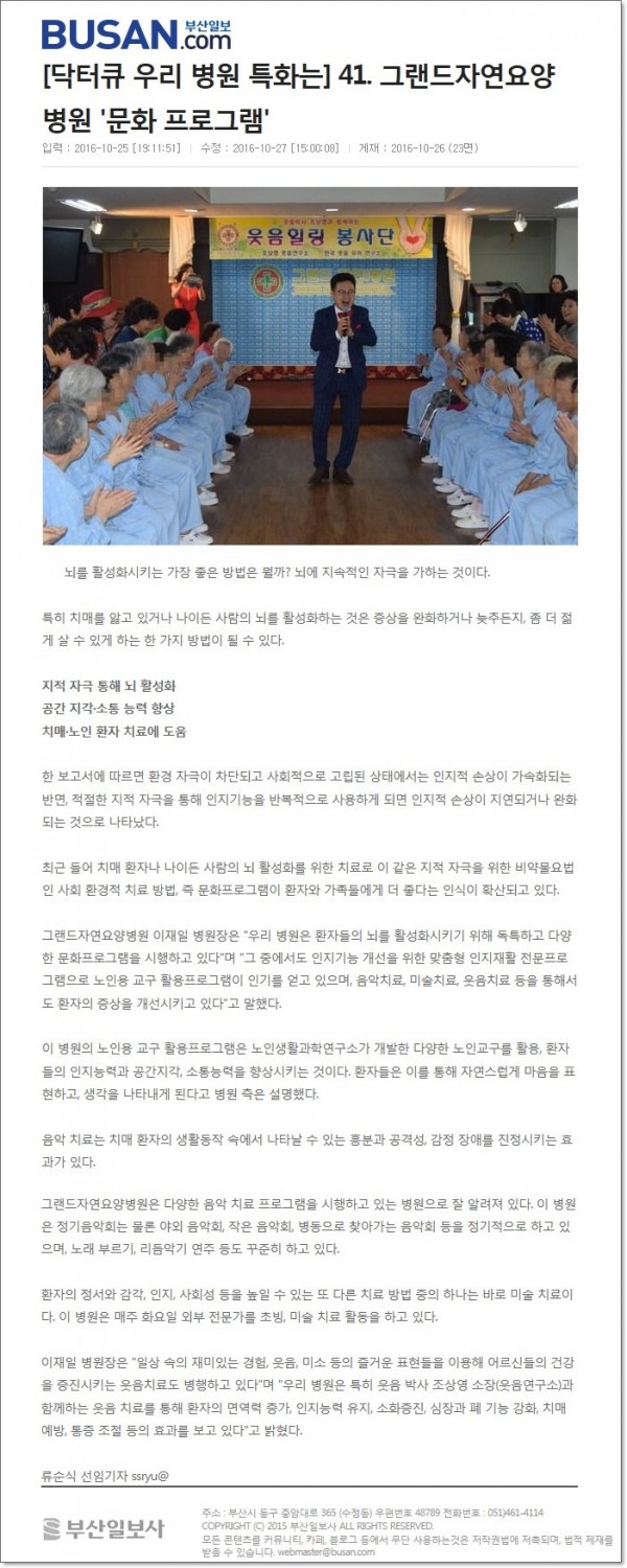 [부산일보] 닥터큐 우리 병원 특화는 - 그랜드자연요양병원 '문화프로그램' 페이지 정보 작성자 최고관리자 작성일16-11-05 16:45 조회1,567회 댓글0건 이전글 다음글 목록 본문 [출처 : 부산일보 2016.10.26 제23면 류순식 기자] 댓글목록 등록된 댓글이 없습니다. 이전글 다음글 목록