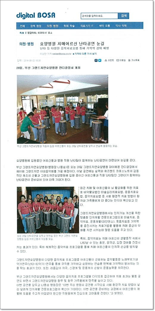 [의학신문] 요양병원 난타공연 눈길 끌어. 페이지 정보 작성자 그랜드자연병원 작성일14-09-11 15:21 조회2,054회 댓글0건 이전글 다음글 목록 본문 [출처 : 의학신문 2014.08.22 / 이상만 기자] 댓글목록 등록된 댓글이 없습니다. 이전글 다음글 목록