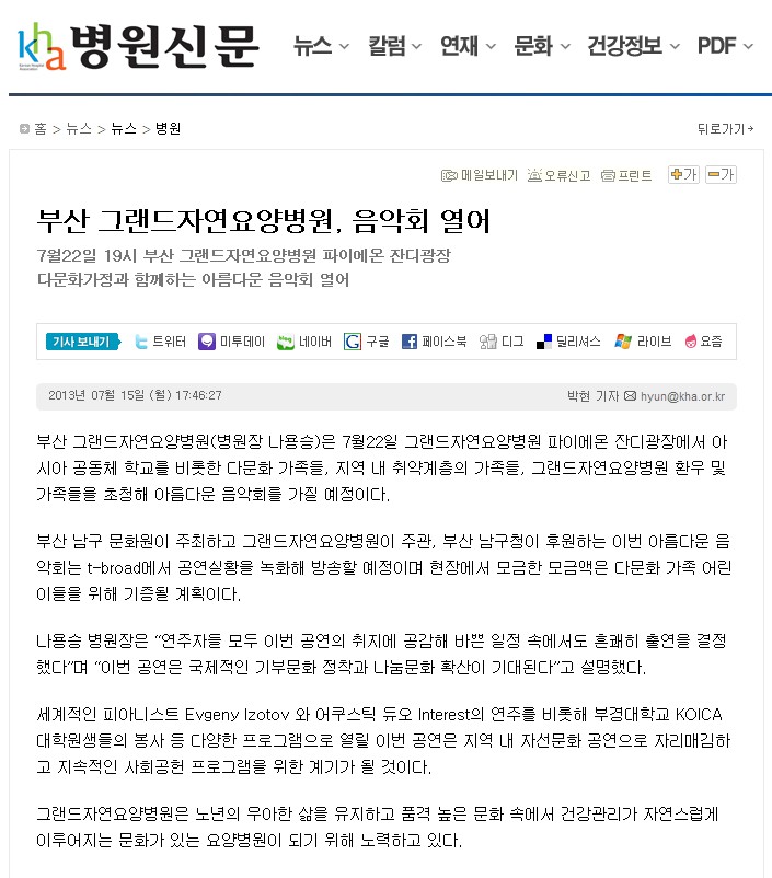 [병원신문]부산 그랜드자연요양병원, 음악회 열어 페이지 정보 작성자 그랜드자연병원 작성일13-08-06 10:57 조회2,094회 댓글0건 이전글 다음글 목록 본문 -[출처:병원신문 2013.7.15./박현기자] 댓글목록 등록된 댓글이 없습니다. 이전글 다음글 목록