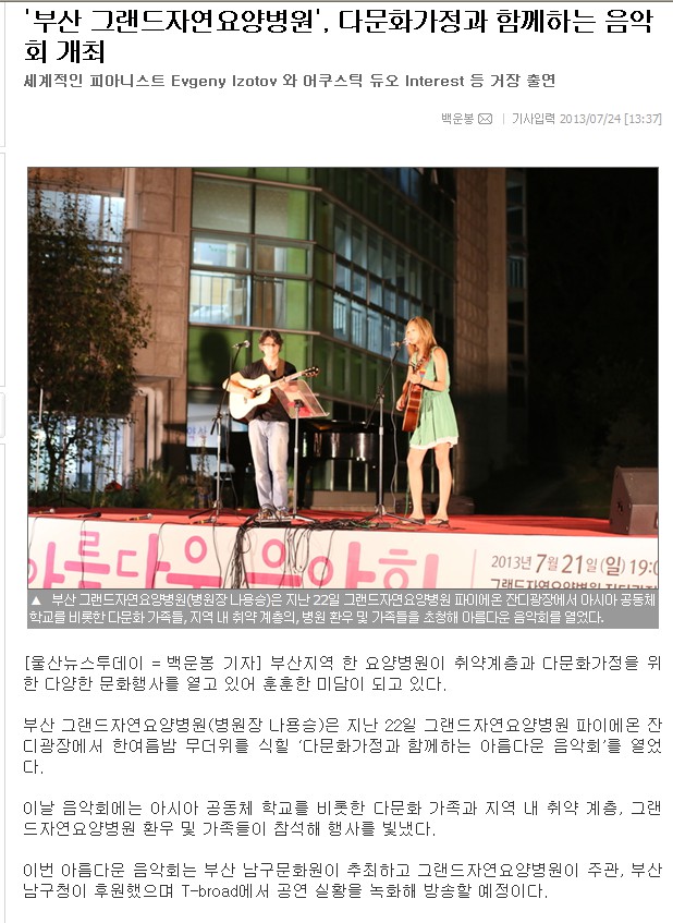 [울산뉴스투데이]부산 그랜드자연요양병원, 다문화가정과 함께하는 음악회 개최. 페이지 정보 작성자 그랜드자연병원 작성일13-08-06 12:04 조회2,053회 댓글0건 이전글 다음글 목록 본문 -[출처:울산뉴스투데이 2013.7.24. 백운봉 기자] 댓글목록 등록된 댓글이 없습니다. 이전글 다음글 목록