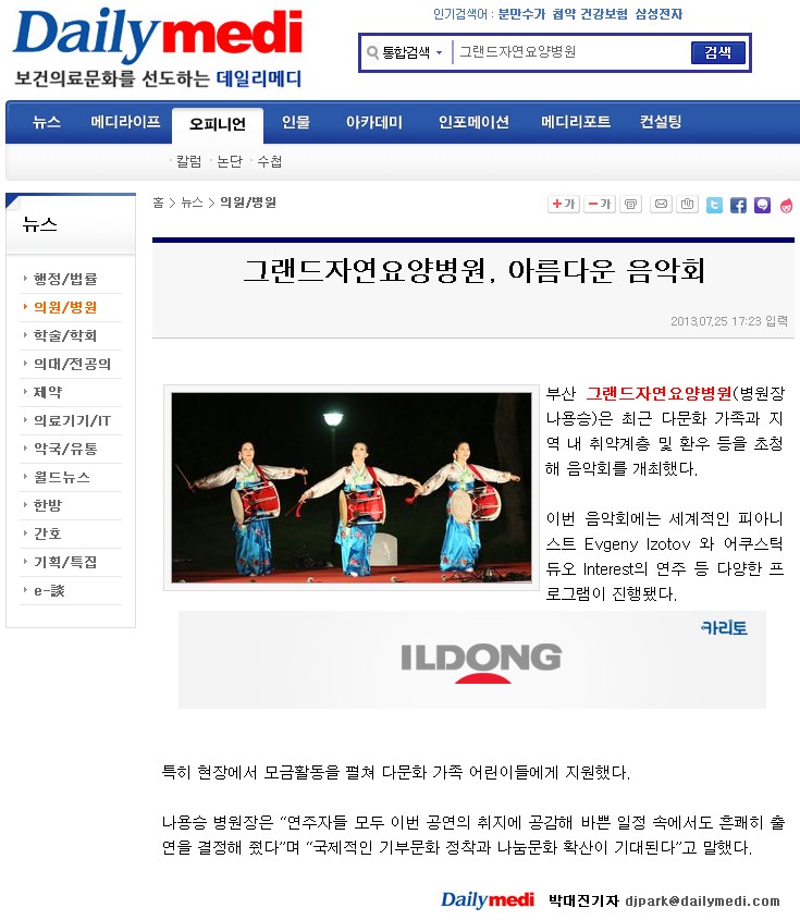 [데일리메디]그랜드자연요양병원 페이지 정보 작성자 그랜드자연병원 작성일13-08-06 12:38 조회1,958회 댓글0건 이전글 다음글 목록 본문 -[출처:데일리메디 2013.7.25./박대진 기자] 댓글목록 등록된 댓글이 없습니다. 이전글 다음글 목록