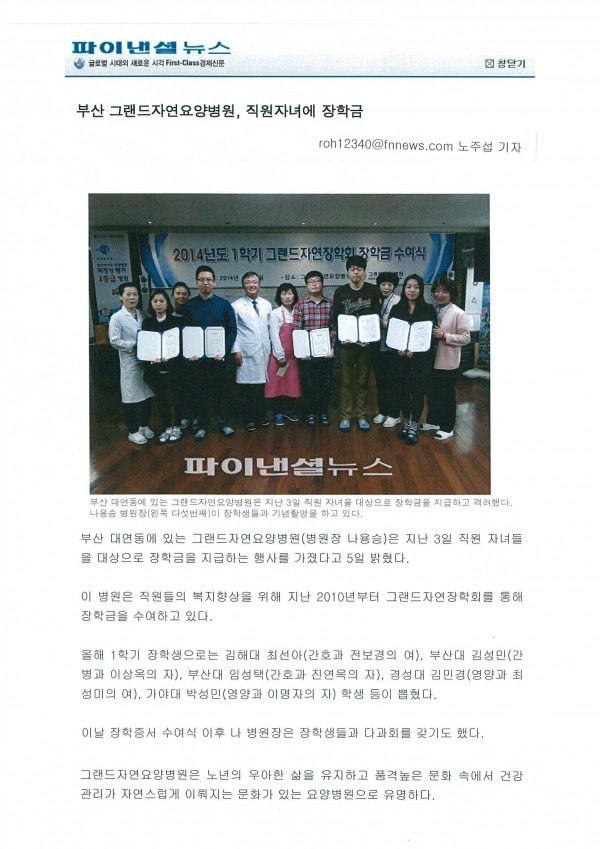 [파이낸셜 뉴스] 부산 그랜드자연요양병원, 직원자녀에 장학금. 페이지 정보 작성자 그랜드자연병원 작성일14-02-10 11:39 조회2,025회 댓글0건 이전글 다음글 목록 본문 [출처 : 파이낸셜 뉴스 2014.2.5./노주섭 기자] 댓글목록 등록된 댓글이 없습니다. 이전글 다음글 목록