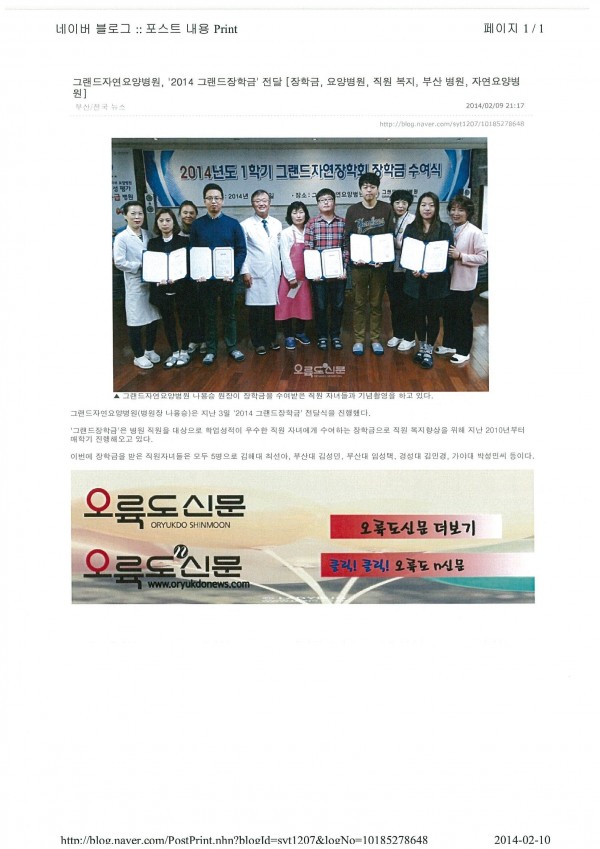 [오륙도신문] 그랜드자연요양병원, '2014 그랜드장학금' 전달 페이지 정보 작성자 그랜드자연병원 작성일14-02-10 11:43 조회1,989회 댓글0건 이전글 다음글 목록 본문 [출처 : 오륙도신문 2014.2.9.] 댓글목록 등록된 댓글이 없습니다. 이전글 다음글 목록