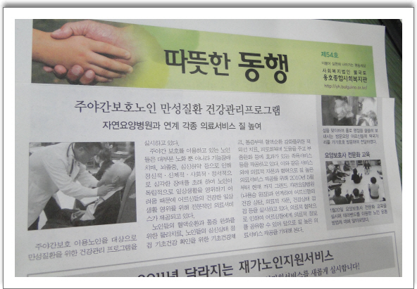 그랜드자연요양병원과 연계 각종 의료서비스 질 높여 주야간보호 이용노인을 대상을 만성질환을 위한 건강관리 프로그램을 실시하고있다.주야간 대부분 노화 뿐 아니라 기능장애 치매,뇌졸증,심신허약 등으로 인해 정신적,신체적,사회적,정신적으로 심각한 장애를 초래하여 노인이 독립적으로 일상생활을 영위하기 어려움 때문에 어르신들의 건강한 일상생활 영위를 위해 전문적인 의료서비스가 제공 되고 있다.노인들의 혈액순환과 통증완화를 위한 물리치료,노인들의 심신상태 점검 기초건강 확인을 위한 기초 건강체크,통증부위 혈액순환 강화를 위한 적외선 치료,피로회복에 도움을 주고 부종완하 등에 효과가 있는 족욕서비스등을 제공하고 있다.이와 같은 서비스 이외에 의료적 자문과 협력으로 질 높은 의료서비스 제공을 위해 2010년5월부터 현재에 이르기까지 그랜드자연요양병원(나용승 병원장)과 연계하여 어르신들의 건강상담,의료적 자문,건강상태의 점검등을 실시하고 있다.의료적 협력으로 인하여 어르신들에게 의료적 정보를 공유할 수 있어 앞으로 질 높은 의료서비스 제공을 기대해 본다. [출처:용호종합사회복지관 발행/2011.3.2]