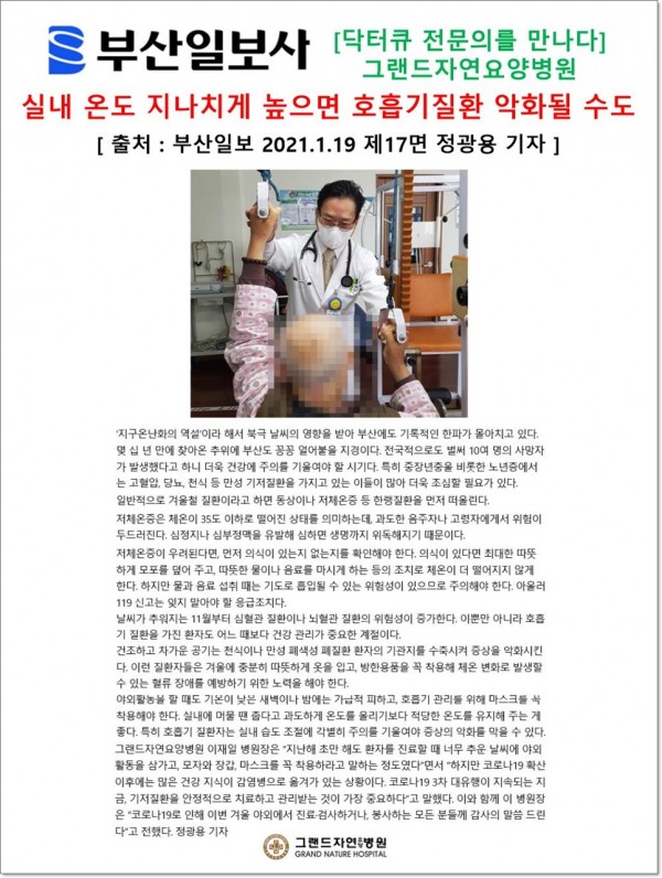 [부산일보] 닥터큐 전문의를 만나다 - 그랜드자연요양병원 이재일 병원장 '실내 온도 지나치게 높으면 호흡기질환 악화될… 페이지 정보 작성자 최고관리자 작성일21-01-20 11:30 조회2,197회 댓글0건 이전글 다음글 목록 본문 [ 출처 : 부산일보 2021. 1.19 제17면 정광용기자 ] 댓글목록 등록된 댓글이 없습니다. 이전글 다음글 목록