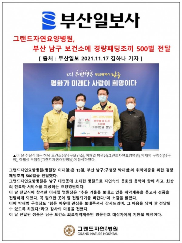 [부산일보] 그랜드자연요양병원, 부산 남구 보건소에 경량패딩조끼 500벌 전달 페이지 정보 작성자 최고관리자 작성일21-11-22 14:55 조회1,895회 댓글0건 이전글 다음글 목록 본문 [ 출처 : 부산일보 2021. 11.17 김하나기자 ] 댓글목록 등록된 댓글이 없습니다. 이전글 다음글 목록