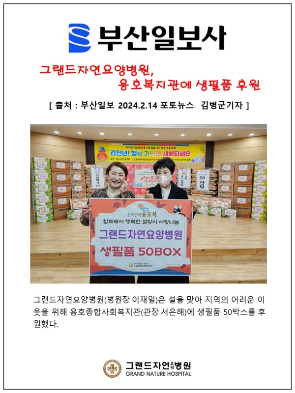 [부산일보] 그랜드자연요양병원, 용호복지관에 생필품 후원 페이지 정보 작성자 최고관리자 작성일24-02-16 11:22 조회1,852회 댓글0건 이전글 다음글 목록 본문 [ 출처 : 부산일보 2024. 2.14 포토뉴스 김병군 기자 ] 댓글목록 등록된 댓글이 없습니다. 이전글 다음글 목록
