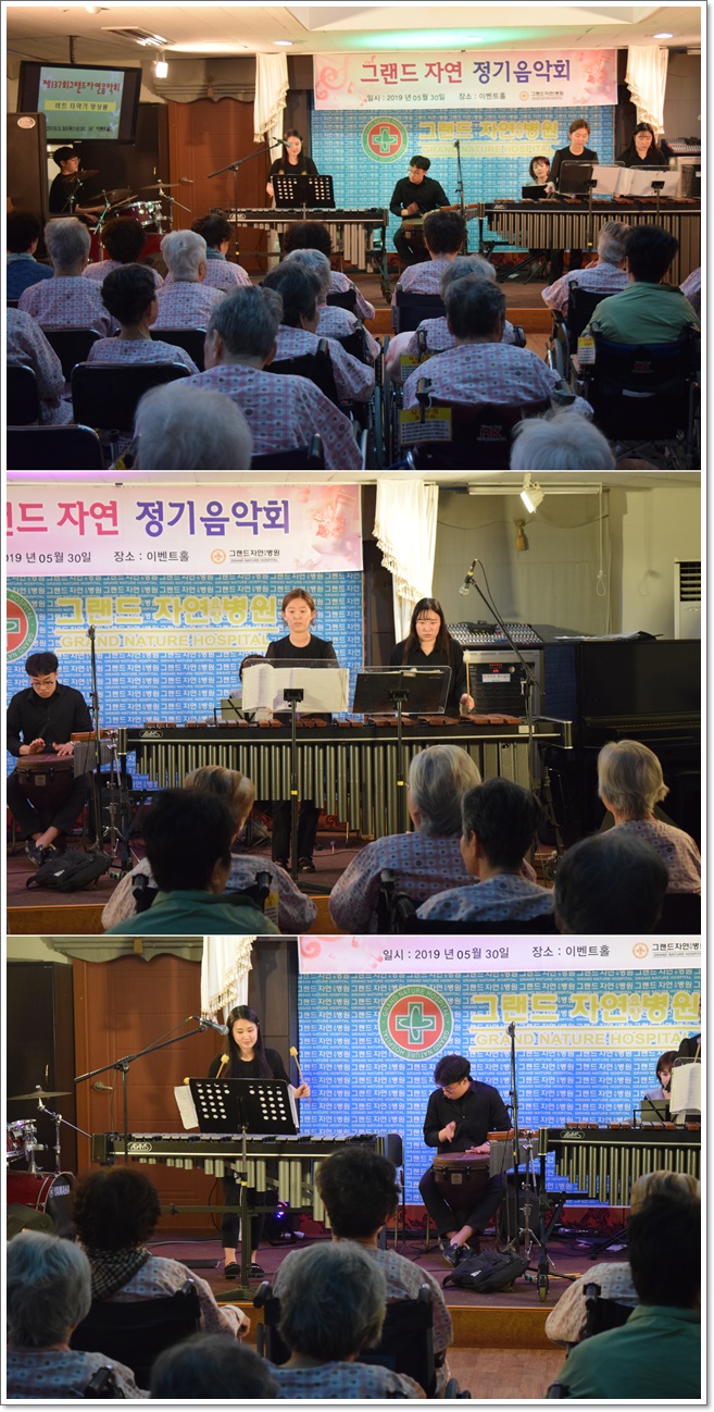 그랜드자연요양병원은 5월 30일 <비트 타악기 앙상블>의 공연으로 제137회 그랜드자연음악회를 열었다. 비트 타악기 앙상블은 타악기의 역동적이고 파워풀한 연주를 보여 주었으며 마림바, 비브라폰 등과 같은 평소 보기 힘든 타악기로 친숙한 음악들을 다양하게 연주해 주었다. 공연을 통해 리듬의 매력을 알게 되었으며 자연스럽게 타악기와 친숙해질 수 있는 시간이 되었다. 어르신들은 공연이 끝나감을 아쉬워하며 앵콜을 연이어 외치셨다.