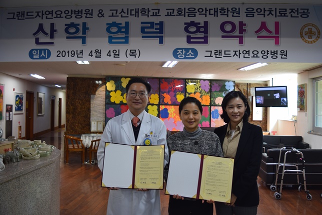 그랜드자연요양병원은 4월 4일 고신대학교 교회음악대학원 음악치료전공과와 정보교환, 인적교류, 물적교류 등에 관한 상호 교류를 활발히 추진하고 상호협력을 통해 지역 발전에 기여하기 위해 산학 협력 협약식을 가졌다.