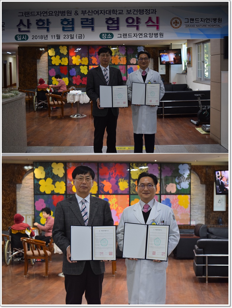 그랜드자연요양병원, 부산여자대학교 보건행정학과와 산학협력협약식 가져. 페이지 정보 작성자 최고관리자 작성일18-12-12 12:13 조회1,064회 댓글0건 이전글 다음글 목록 본문 그랜드자연요양병원은 11월 23일 부산여자대학교 보건행정학과와 정보교환, 인적교류, 물적교류 등에 관한 상호 교류를 활발히 추진하고 상호협력을 통해 지역 발전에 기여하기 위해 산학 협력 협약식을 가졌다. 댓글목록 등록된 댓글이 없습니다. 이전글 다음글 목록