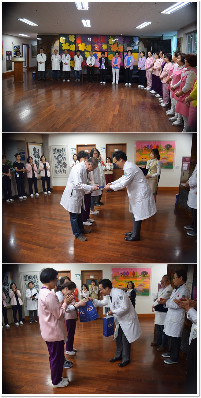 11월 1일 그랜드자연요양병원은 1층 로비에서 전직원들이 참석한 가운데 그랜드자연 11월 월례회를 가졌다. 이재일원장은 11월을 맞은 그랜드자연 가족 여러분들 모두에게 올 한해 좋은 결실들이 맺어질 수 있게 다시 한 번 점검하는 계절로 거듭나기를 강조하였다. 이어서 신입직원들의 인사가 이어졌고, QPS위원회 위원과 감염위원회 위원의 새로이 임명되는 위원들에 대한 임명장을 수여하였다. 또한 수능 자녀를 둔 직원들을 격려하며 수능 대박을 기원하는 마음을 모아 준비한 쵸콜렛을 전달하였다. 따뜻함이 넘치는 11월 월례회를 전직원들은 11월을 준비하는 마음으로 병원 구호를 끝으로 월례회를 마쳤다.