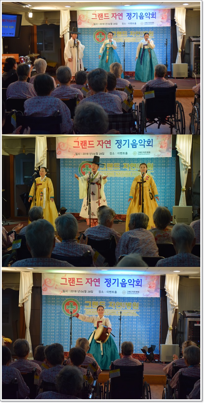 지난 6월 28일 그랜드자연요양병원은 <한국서도민요 보존회>의 공연으로 제126회 그랜드자연음악회를 열었다. <한국서도민요 보존회>는 우리가 흔히 알고 있던 민요 뿐 아니라 한오백년, 강원도 아리랑, 해주 아리랑 등 우리 어르신들이 좋아 하시는 민요와 대금의 연주 등으로 어르신들과 흥겨움을 함께 나누었다.