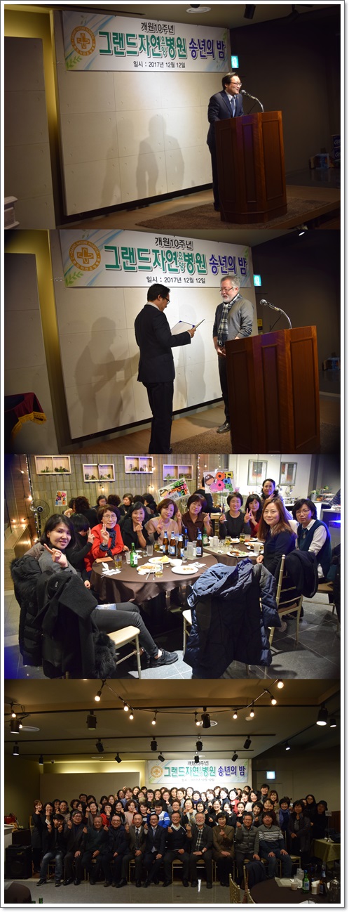 지난 12월 12일 그랜드자연요양병원은 2017년 그랜드 송년의 밤 행사를 가졌다. 장기 근속자에 대한 시상과 노인용 교구 활용 프로그램, 미술치료, 웃음치료, 음악치료 등 자원봉사자들에 대한 감사장이 수여되었으며 덕담과 감사의 마음을 나누며 한해를 마무리 하는 시간을 가졌다. 또한 나용승 명예원장과 이재일 병원장은 우리 직원들의 수고에 감사하며 장기 근속자들을 큰 재산으로 생각하고 있다고 송년사를 대신하였다. 2부에서는 개원10주년을 맞아 부서별로 직원들의 끼를 맘껏 표현할 수 있는 무대로 꾸며졌다. 김용철 부원장의 건배사와 함께 2017년 한해를 마무리하고 또 다른 새해를 준비하는 마음으로 송년의 밤을 마쳤다.
