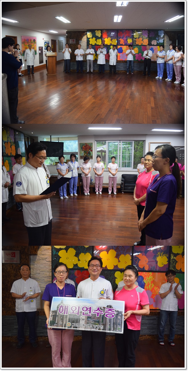 그랜드자연요양병원은 지난 10월 2일 1층 로비에서 전직원들이 참석한 가운데 그랜드자연 월례회를 가졌다. 신입직원들의 인사를 가진 후, 10월에 생일을 맞이한 직원들을 축하하며 작은 정성으로 마련된 선물이 전달 되었다. 또한, 2017년도 하반기 우수직원에 대한 시상이 이어졌으며 수상자는 간호과 문선미 선생님과 간병과 이상옥 여사님이다. 우수직원 수상자들은 상반기에 수상하신 분들과 함께 11월에 해외여행을 계획하고 있다.