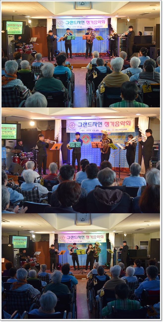 지난 4월 27일 그랜드자연요양병원은 부산시립교향악단 금관5중주 Brass Quintet의 초청공연으로 제112회 그랜드자연음악회를 열었다. 슈람멜의 <비엔나는 언제나 비엔나>행진곡을 시작으로 한곡 한곡의 배경설명을 들으며 어르신들이 좋아하는 민요, 옛가요의 연주로 함께하며 즐거운 시간을 보냈다.