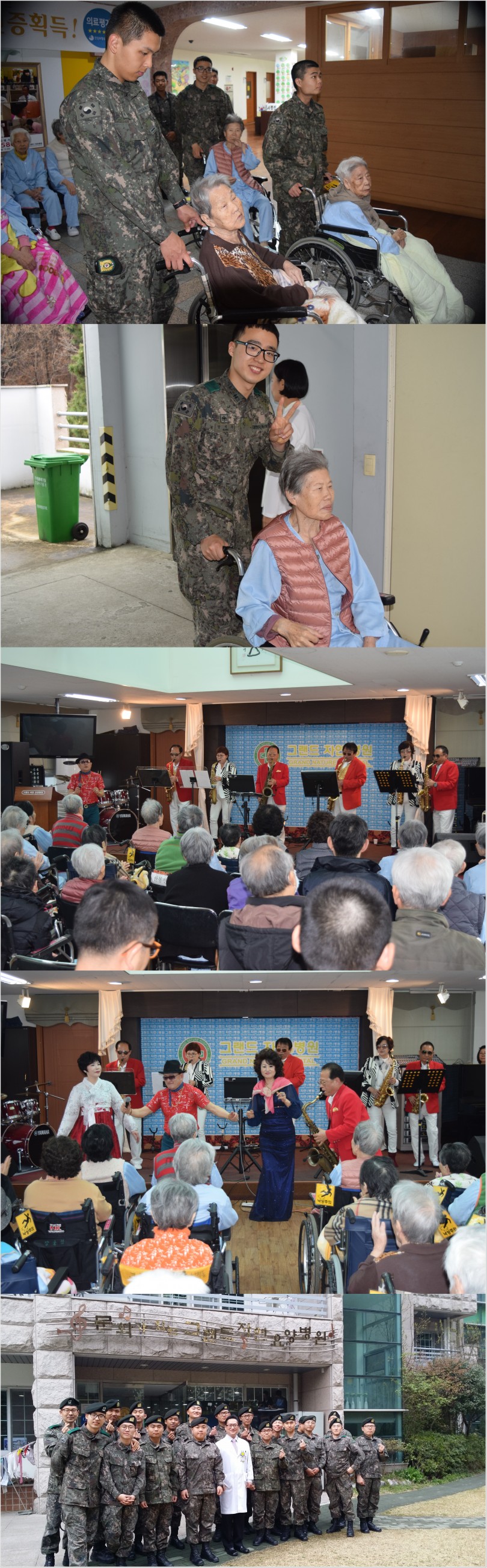 지난 3월 29일 그랜드자연요양병원은 한바다 색소폰 연주단의 공연으로 작은 음악회를 가졌다. 이날은 육군 제53보병사단 정보통신대대의 장병들이 함께 해 더욱 뜻깊은 시간이 되었다. 장병들은 휠체어에 사랑을 싣고 의미있는 시간을 가졌으며, 어르신들과 함께 공연장을 찾기도 했다.