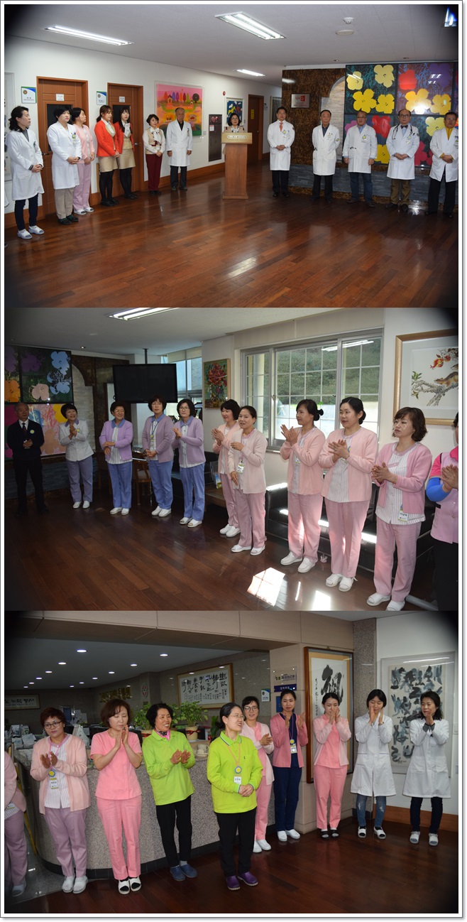그랜드자연요양병원은 지난 4월 3일 1층 로비에서 전직원들이 참석한 가운데 그랜드자연 월례회를 가졌다. 이재일 병원장은 어르신들의 건강 관리에 만전을 기하자는 말씀과 함께 수고하는 직원들을 격려하였다. 이어서 신입직원들의 인사가 이어졌고 4월에 생일을 맞이한 직원들을 축하하며 작은 정성으로 마련된 선물이 전달되었다. 봄내음이 짙어가는 4월을 준비하는 마음으로 "그랜드 그랜드 힘!"의 구호와 함께 4월 월례회를 마쳤다.