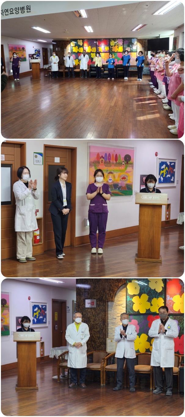 그랜드자연요양병원은 4월 1일 1층 로비에서 전직원들이 참석한 가운데 그랜드자연 월례회를 가졌다. 하필성 부원장은 어르신들의 건강 관리에 만전을 기하자는 말씀과 함께 수고하는 직원들을 격려하였다. 이어서 신입직원들의 인사가 이어졌고 봄내음이 짙어가는 4월을 준비하는 마음으로 "그랜드 그랜드 힘!"의 구호와 함께 4월 월례회를 마쳤다.