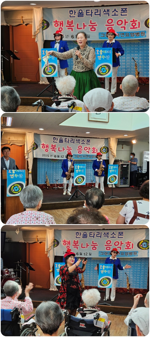 그랜드자연요양병원은 6월 12일 한울타리 색소폰의 <행복 나눔>공연으로 작은 음악회를 열었다. 이날 공연은 <울고넘는 박달재>, <강원도 아리랑> 등의 색소폰 연주와 <섬마을 선생님>, <부초같은 인생> 등의 옛가요로 어르신들과 함께 즐거운 시간을 마련했다.