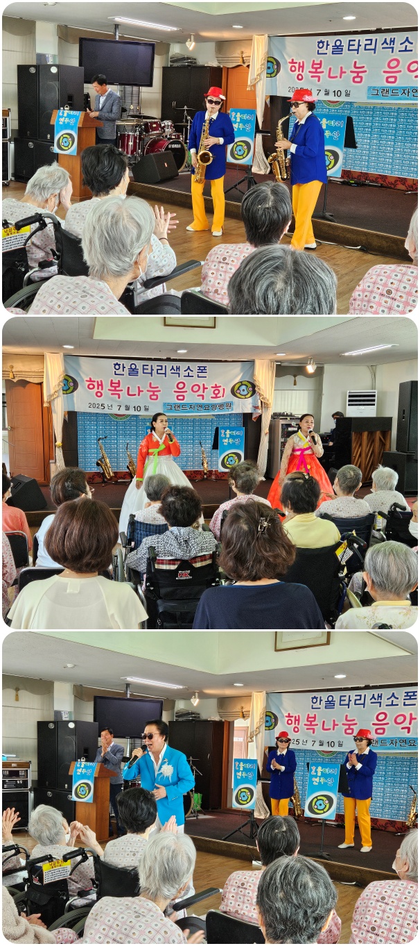 7월 10일 한울타리 연주단의 공연으로 그랜드자연요양병원 5층 이벤트홀에서 작은음악회가 열렸다. 한울타리 연주단은 <물새 우는 강 언덕>, <진도 아리랑>등 어르신들이 평소 즐겨 부르시는 옛가요와 민요를 비롯하여 색소폰 연주로 어르신들과 함께 흥겨운 시간을 마련했다.