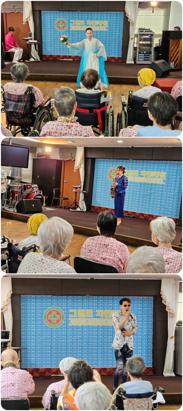 그랜드자연요양병원은 8월 28일 엔젤 예술단의 공연으로 작은 음악회를 열었다. 이날 공연은 어르신들이 평소 즐겨 부르시는 옛가요를 비롯하여 색소폰 연주와 고전 무용으로 어르신들과 함께 즐거운 시간을 마련했다.