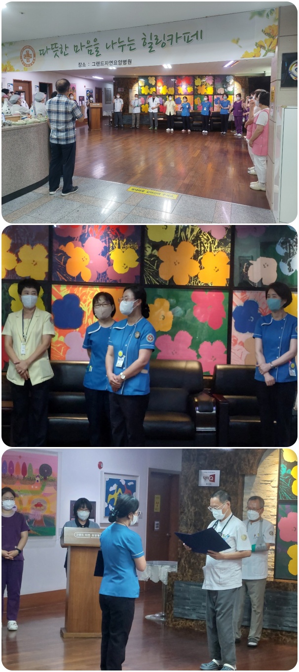 그랜드자연요양병원은 9월 2일 1층 로비에서 전 직원들이 참석한 가운데 그랜드자연 월례회를 가졌다. 환절기 어르신들의 건강 관리에 만전을 기하자고 강조하였으며, 이어서 신입직원들의 인사와 공로상 전달이 이어졌고 QPS위원회 위원과 감염관리위원회 위원의 새로이 임명되는 위원에 대한 임명장을 수여하였다.