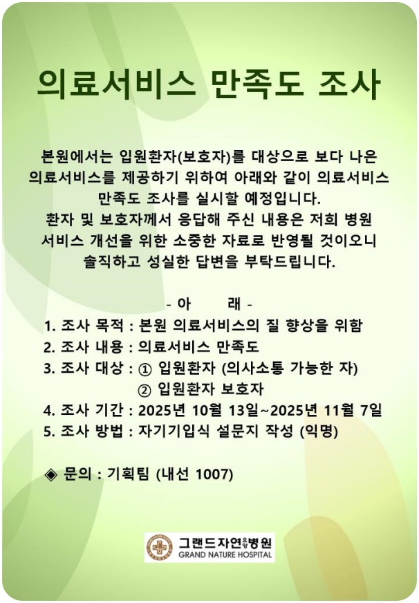 의료서비스 만족도 조사(2025년10월13일~11월7일) 페이지 정보 작성자 최고관리자 작성일25-10-10 12:24 조회310회 댓글0건 이전글 다음글 목록 본문 의료서비스 만족도 조사 댓글목록 등록된 댓글이 없습니다. 이전글 다음글 목록