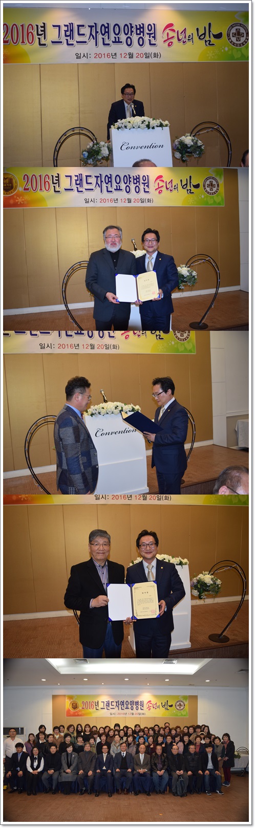 지난 12월 20일 그랜드자연요양병원은 2016년 그랜드 송년의 밤 행사를 가졌다. 장기 근속자에 대한 시상과 노인용 교구 활용 프로그램, 미술치료, 웃음치료, 음악치료 등 자원봉사자들에 대한 감사장이 수여되었으며 덕담과 감사의 마음을 나누며 한해를 마무리 하는 시간을 가졌다. 또한 나용승 명예원장과 이재일 병원장은 우리 직원들의 수고에 감사하며 장기 근속자들을 큰 재산으로 생각하고 있다고 송년사를 대신하였다. 김용철 부원장의 건배사와 함께 2016년 한해를 마무리하고 또 다른 새해를 준비하는 마음으로 송년의 밤을 마쳤다.