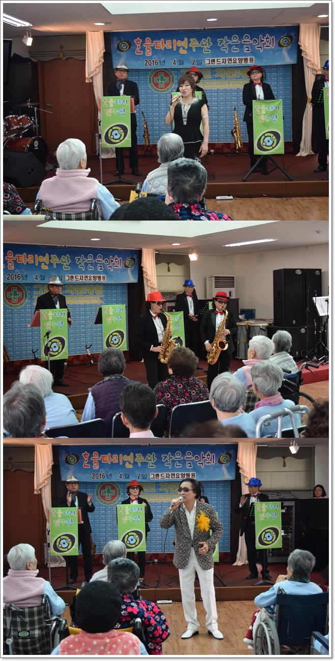 4월의 작은 음악회 - 한울타리 연주단 공연 페이지 정보 작성자 최고관리자 작성일16-05-13 11:26 조회1,241회 댓글0건 이전글 다음글 목록 본문 지난 4월 7일 한울타리 연주단의 공연으로 작은 음악회가 그랜드자연요양병원 5층 이벤트홀에서 열렸다.가수 최명운의 <나그네 설움> <청산유수>를 시작으로 김영화, 서용 등의 흥겨운 무대로 어르신들의 어깨를 들썩이게 하는 즐거운 시간이었다. 댓글목록 등록된 댓글이 없습니다. 이전글 다음글 목록