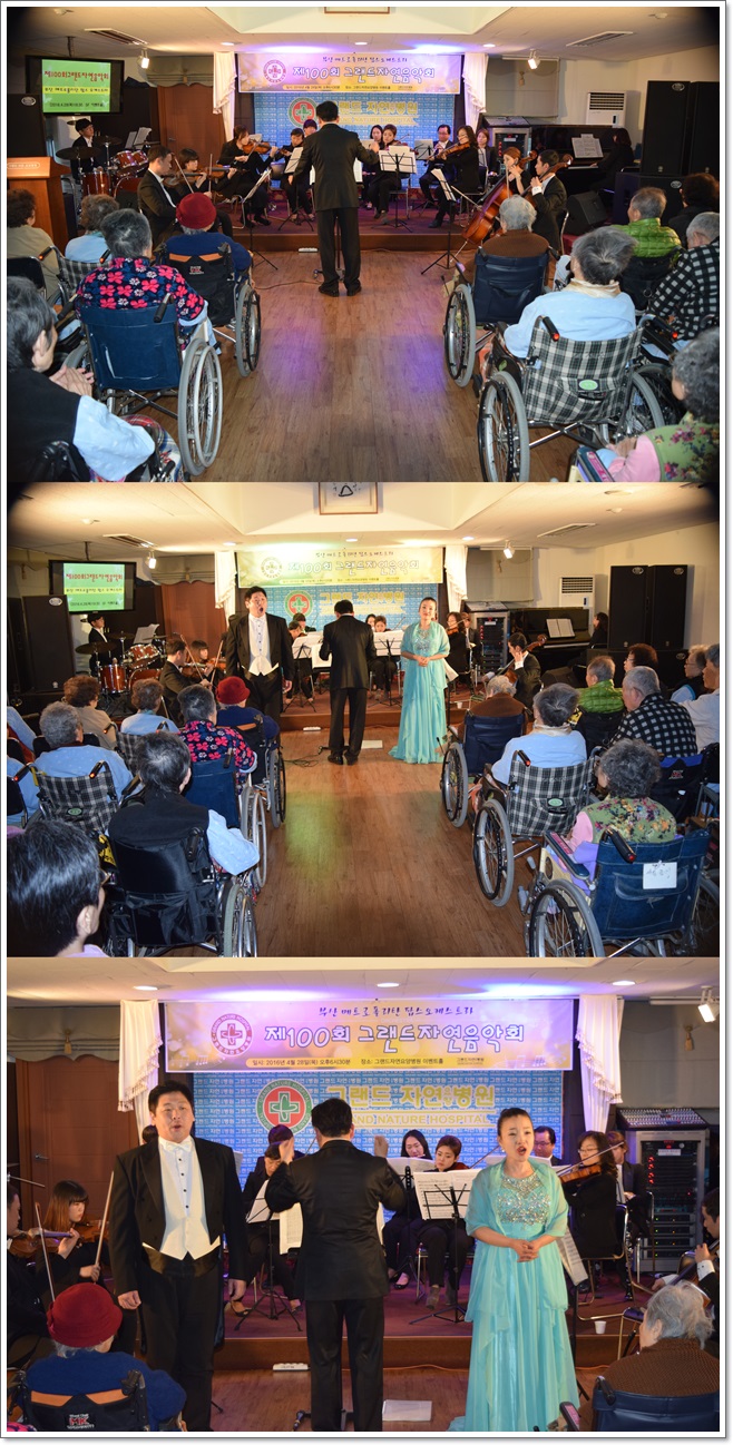 지난 4월28일 그랜드자연요양병원은 부산 메트로폴리탄 팝스 오케스트라의 공연으로 제100회 그랜드자연음악회를 열었다. 이날 공연은 20여명의 단원이 <백조의 호수> <바로크 뮤직 컬렉션> 등 정통 클래식 음악부터 어르신들이 평소 즐겨 부르시는 트로트 메들리까지 10여곡을 선보이며 어르신들의 몸과 마음을 힐링할 수 있는 시간을 가졌다.