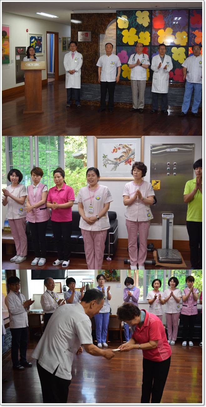 그랜드자연요양병원은 지난 6월 1일 1층 로비에서 전직원들이 참석한 가운데 그랜드자연 월례회를 가졌다. 이재일 병원장은 날씨가 더워짐에 있어 어르신들의 건강 관리에 만전을 기하자고 강조하였으며. 이어서 신입직원들의 인사가 이어졌고 6월에 생일을 맞이한 직원들을 축하하며 작은 정성으로 마련된 선물이 전달되었다.