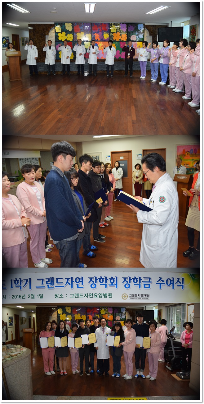 그랜드자연요양병원은 지난 2월 1일 1층 로비에서 전직원들이 참석한 가운데 그랜드자연 2월 월례회 및 2016년도 1학기 그랜드자연 장학회 장학금 수여식을 가졌다. 그랜드자연요양병원은 직원들의 복지향상을 위해 2010년부터 그랜드자연장학회를 통해 장학금을 수여하고 있다. 이날 이재일 병원장은 직원들의 자녀 가운데 학업 성적이 우수한 학생들을 초청하여 장학금을 전달하며 격려를 아끼지 않았다. 장학증서 수여식후 병원장은 장학생들과 다과회를 가지며 소중한 만남의 일정을 마쳤다.