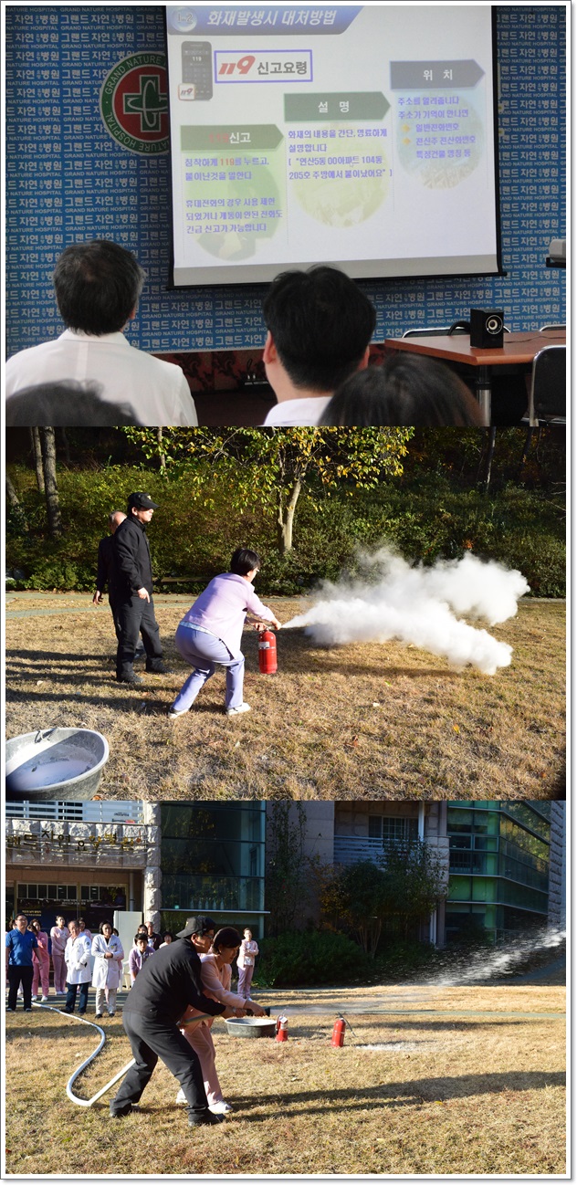 그랜드자연요양병원에서는 지난 12월 4일 전직원을 대상으로 소방교육을 실시했다. 이날 교육은 이론 및 영상교육에 이어서 소화기 사용법, 소화전 관리 및 사용법 등 모의진압훈련 형식으로 진행됐다. 훈련에 참여한 직원들은 실제로 소방장비를 다루어 보며, 앞으로 자위소방대활동을 강화하고 소방서와 함께 예방하는 소방훈련이 될 수 있도록 더욱 노력하자고 소방교육을 마쳤다.
