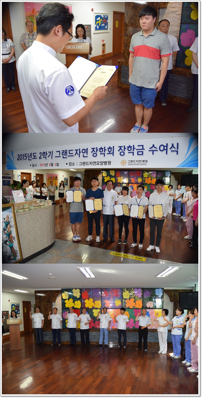 그랜드자연요양병원은 지난 8월 3일 1층 로비에서 전직원들이 참석한 가운데 8월 월례회 및 2015년도 2학기 그랜드자연 장학회 장학금 수여식을 가졌다. 그랜드자연요양병원은 직원들의 복지향상을 위해 2010년부터 그랜드자연 장학회를 통해 장학금을 수여하고 있다. 이날 이재일 병원장은 직원들의 자녀 가운데 학업 성적이 우수한 대학 재학생들을 초청하여 장학금을 전달하며 다과회를 통해 소중한 만남을 가졌다.