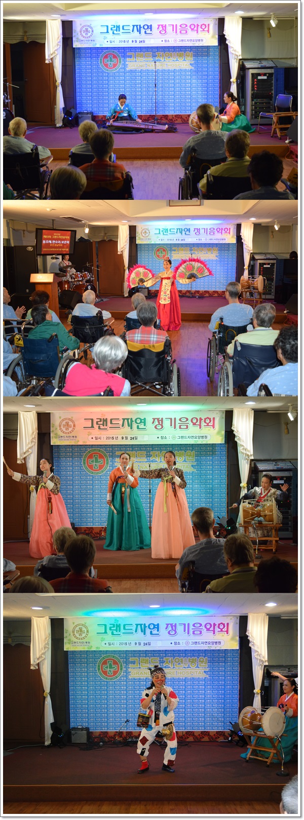 지난 9월 24일 그랜드자연요양병원은 동초제 판소리 보존회의 초청공연으로 제93회 그랜드자연음악회를 열었다.이날 공연은 김정애 단장의 진행으로 가야금 독주, 부채춤, 소금독주 등과 남도민요, 경기민요 등 다양한 프로그램을 선보였다. 특히, 김순자 선생님의 각설이타령은 우스꽝스런 몸짓과 분장을 한 각설이가 신명나게 장타령을 불러 어르신들로 하여금 웃음을 자아내게 하였다.