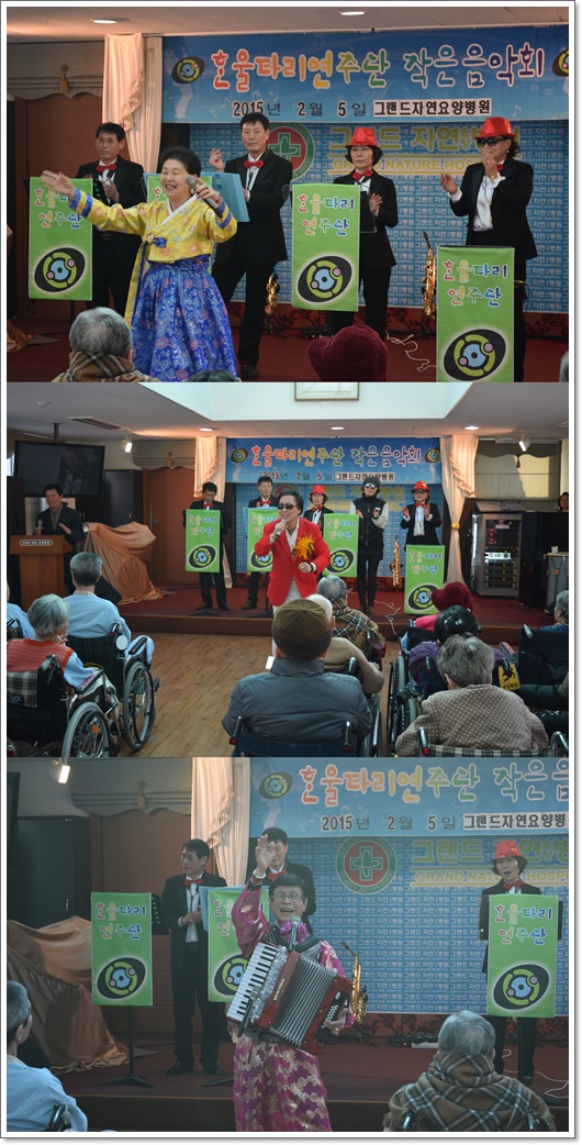 지난 2월 5일 그랜드자연요양병원을 찾은 한울타리 연주단은 가수 최명운의 추억의 소야곡, 청산유수를 시작으로 가수 서용의 빈손 등 흥겨운 옛가요를 비롯하여 색소폰의 합주로 어르신들과 함께 할 수 있는 흥겨운 시간을 마련했다. 가수 임대윤의 아코디언 연주와 함께하는 추억의 시간은 늘 어르신들의 어깨를 들썩이게 한다.