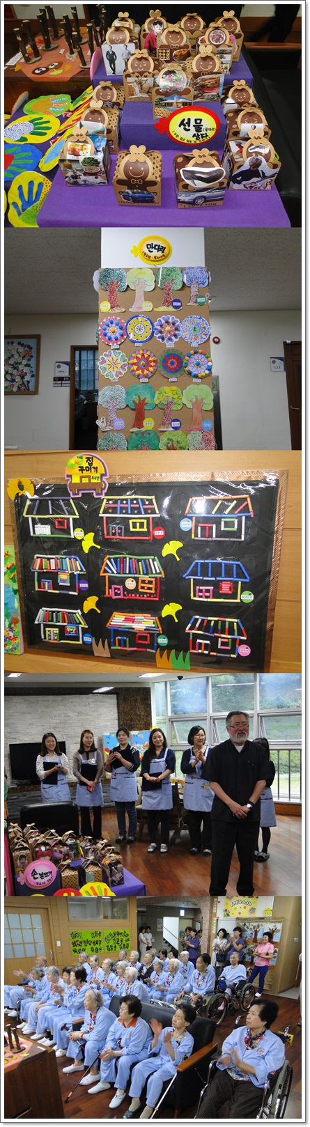 그랜드자연요양병원은 지난 9월 23일 2층 문화홀에서 <미술심리치료 작품 전시회 - 그림으로 마음읽기> 작품전을 열었다. 그랜드자연요양병원은 한 주도 빠짐없이 어르신들을 위해 미술치료 수업을 해주신 윤석환 교수님께 감사의 말씀을 전하며 맨투맨 수업을 해주신 이영순, 윤소현, 정명희, 손지형, 유나정, 최유정 선생님께 감사장을 수여 하였다. 미술의 기법을 이용한 작품들이지만 그 과정속에는 눈과 손의 힘을 기르는 활동과 공간 지각 능력을 갖게 하는 활동들이 포함되어 있다. 작품을 감상한 후 어르신들과 다과의 시간을 가지며 지난 수업의 이야기꽃을 피웠다.
