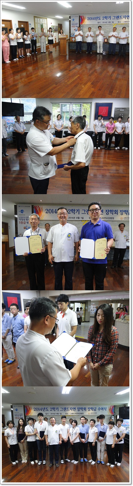 그랜드자연요양병원은 지난 8월 1일 1층 로비에서 전직원들이 참석한 가운데 그랜드자연 월례회 및 2014년도 2학기 그랜드자연 장학회 장학금 수여식을 가졌다. 그랜드자연요양병원(병원장 나용승)은 직원들의 복지향상을 위해 2010년부터 그랜드자연 장학회를 통해 장학금을 수여하고 있다. 이날 나용승 병원장은 직원들의 자녀 가운데 학업 성적이 우수한 대학 재학생들을 초청하여 장학금을 전달하며 다과회를 통해 소중한 만남을 가졌다. 또한, 그랜드자연요양병원을 위해 봉사를 아끼지 않고 계신 분들을 위한 <그랜드 봉사상>의 시상에는 나용승 병원장이 직접 순금배지를 달아 드리며 격려를 아끼지 않았다.