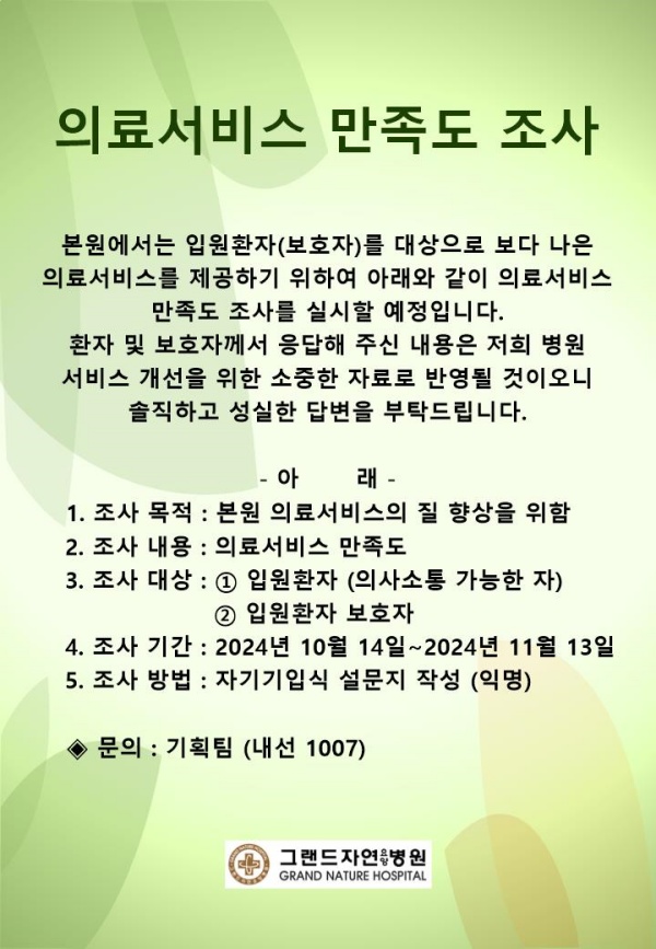 의료서비스 만족도 조사(2024년10월14일~11월13일) 페이지 정보 작성자 최고관리자 작성일24-10-07 15:40 조회524회 댓글0건 이전글 다음글 목록 본문 의료서비스 만족도 조사 댓글목록 등록된 댓글이 없습니다. 이전글 다음글 목록
