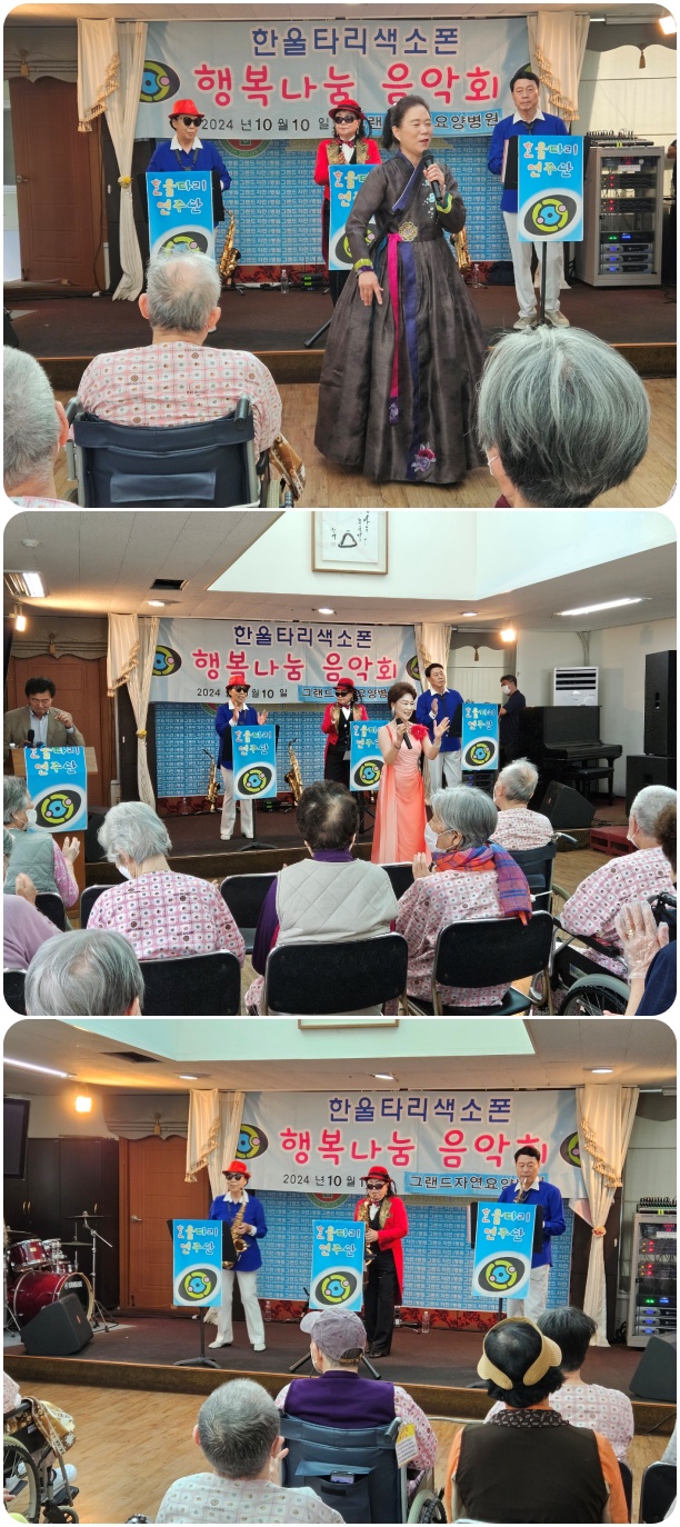 그랜드자연요양병원은 10월 10일 한울타리 색소폰의 <행복 나눔>공연으로 작은 음악회를 열었다. 이날 공연은 <물새우는 강언덕>, <부산 갈매기> 등의 색소폰 연주와 <노들강변>, <진도아리랑> 등의 옛가요, 민요 등으로 어르신들과 함께 즐거운 시간을 마련했다.