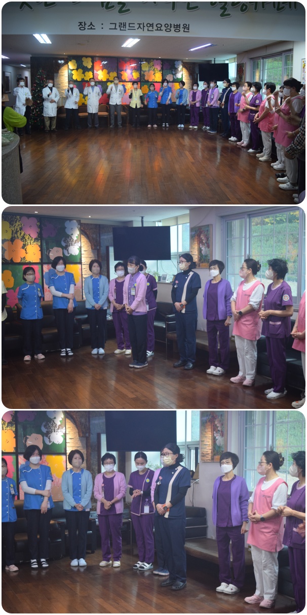 12월 2일 그랜드자연요양병원은 1층 로비에서 전직원들이 참석한 가운데 그랜드자연 12월 월례회를 가졌다. 이날 이재일 병원장은 한해를 잘 마무리하는 12월이 될 것을 강조하며 내년을 준비하는 한달을 만들자고 인사에 대신하였다. 이어서 신입직원의 인사가 이어졌고 한해의 마지막 달 12월의 시작을 준비하는 마음으로 "그랜드 그랜드 힘!"의 구호와 함께 12월 월례회를 마쳤다.