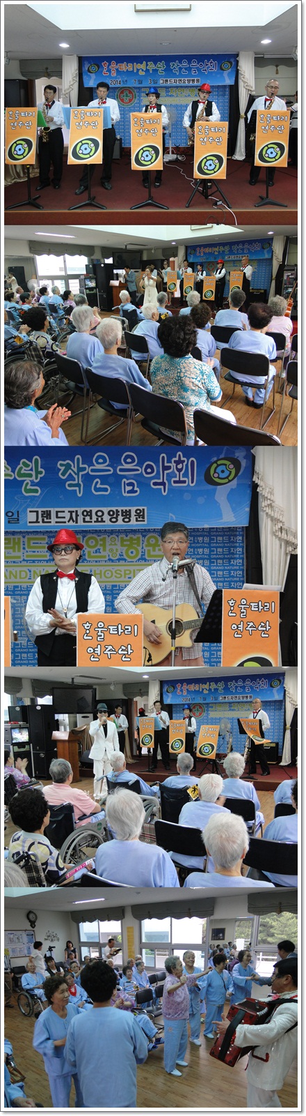지난 7월 3일 한울타리 연주단의 공연이 그랜드자연요양병원 5층 이벤트홀에서 열렸다. 매월 한차례 문화 봉사 활동을 펼치고 있는 한울타리 연주단의 이날 공연은 가수 서용의 흥겨운 옛가요를 비롯하여, 색소폰의 합주로 어르신들과 함께 할 수 있는 흥겨운 시간을 마렸했다. 공연내내 어르신들의 입가에는 미소가 가득했다..