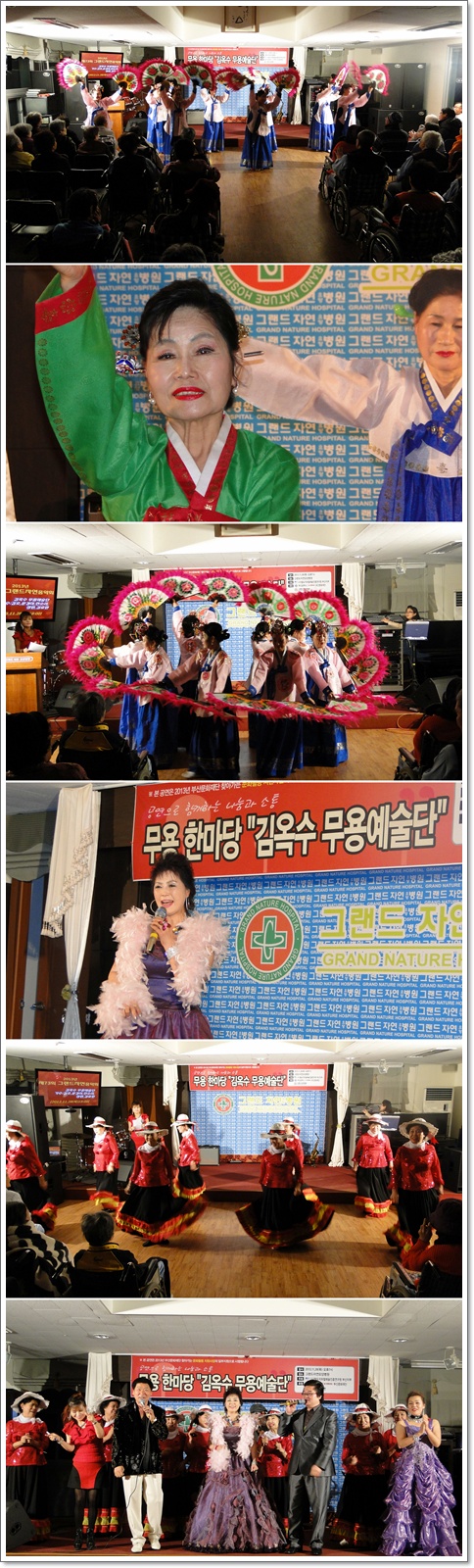 지난 11월 28일 그랜드자연요양병원은 김옥수 무용예술단과 함께 제73회 그랜드자연음악회를 열었다. 김옥수 무용예술단은 부채춤을 시작으로 갑돌이와 갑순이, 즐거운 스페인춤을 차례로 선보였다. 또한 가수 주영아, 김종규, 김호의 특별출연으로 어르신들이 함께 할 수 있는 옛가요로 흥겨운 시간을 보냈다. 쌀쌀한 바람이 옷깃을 여미게 만드는 계절, 사랑으로 다가가는 그랜드자연요양병원. 여기는 사랑의 온도 가득한 그랜드자연요양병원입니다.